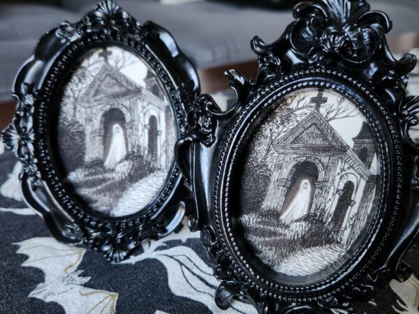 This high-quality print allows you to experience the haunting details of the “Watcher at the Crypt”. Printed on 100% cotton hot press paper with museum-grade inks, the 1:1 format brings out the intricate textures of the crypt’s stonework and the delicate, spectral form of the ghost. It’s an ideal piece for creating a dramatic focal point in any room.